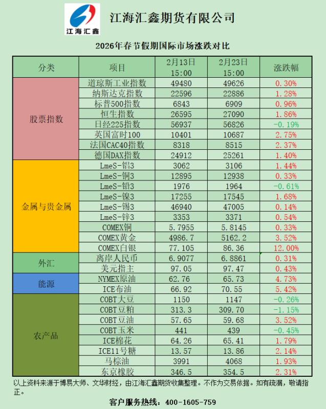 2026年春节假期国际市场涨跌对比
